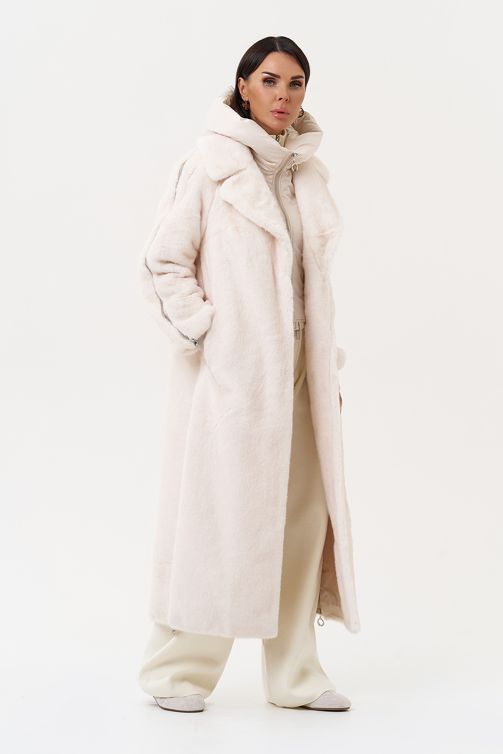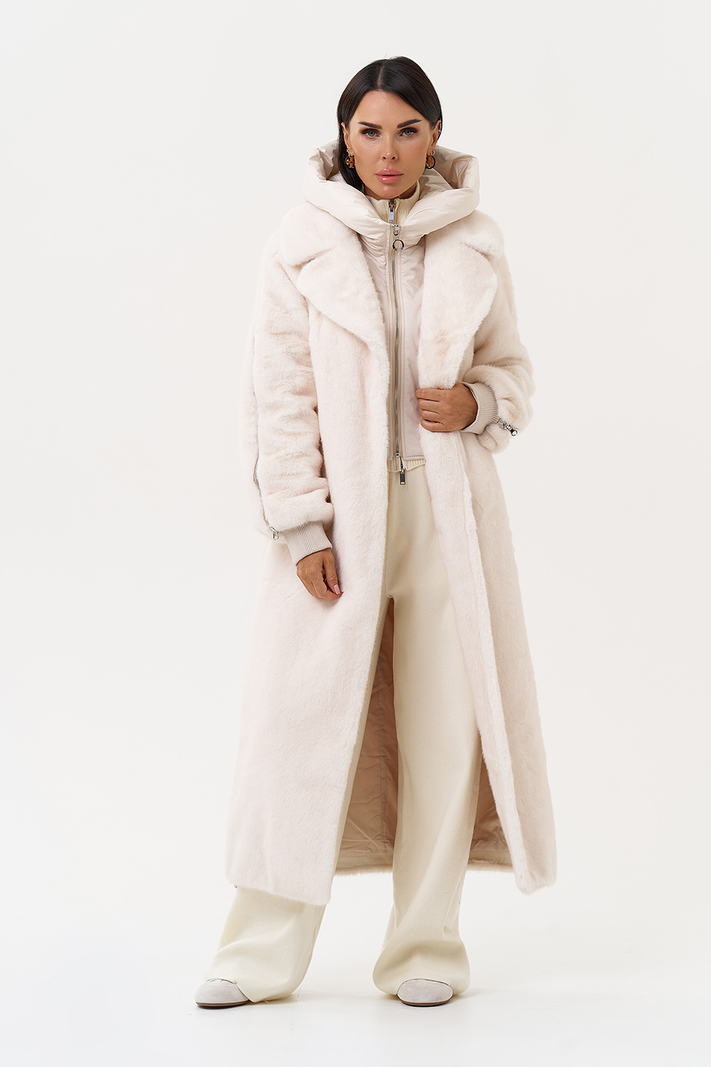 Фасон - прямой Длина изделия - 120 см Цвет - светло-бежевый (молочный) Материал - экомех Состав полотна - полиэстер 100% Подкладка - полиэстер 100% Вид застежки - крючки, пояс Вид ворота - съёмный капюшон, английский воротник Фасон рукава - реглан, длинный |